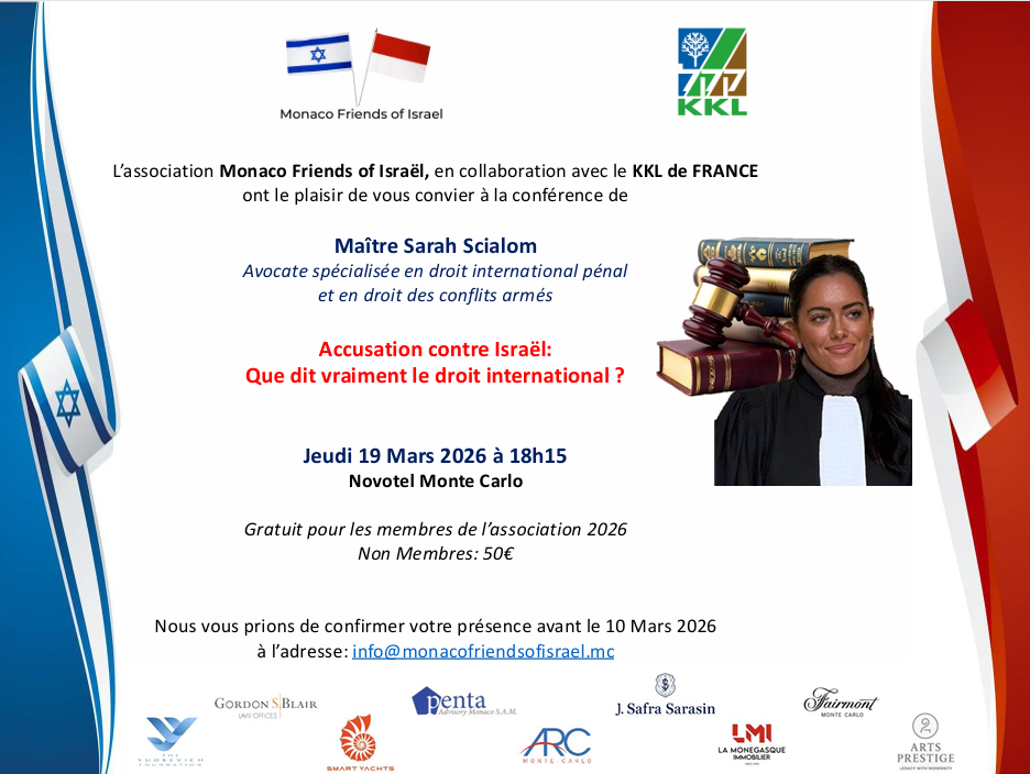L’association Monaco Friends of Israël, en collaboration avec le KKL de France ont le plaisir de vous convier à la conférence de :